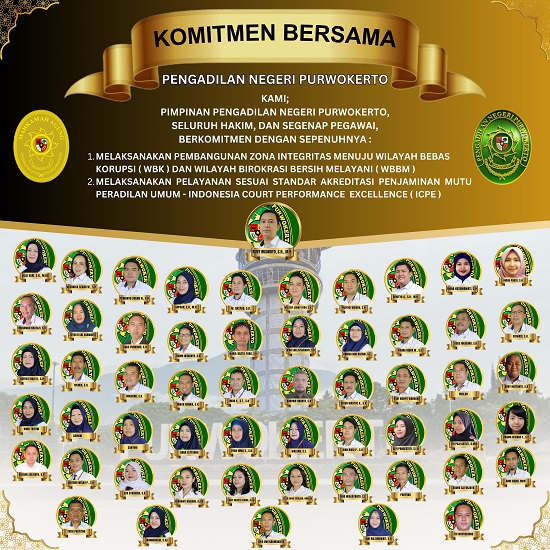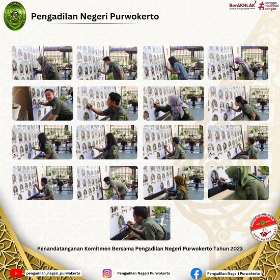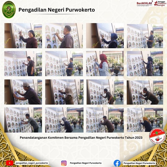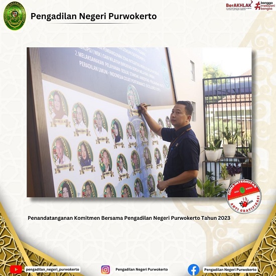 Selasa, 30 Mei 2023, telah dilaksanakan penandatanganan Komitmen Bersama oleh Ketua Pengadilan Negeri Purwokerto Bapak Rudy Ruswoyo, S.H.,M.H. beserta seluruh Hakim, Pejabat struktural, Pejabat fungsional, Seluruh ASN dan PPNPN Pengadilan Negeri Purwokerto.