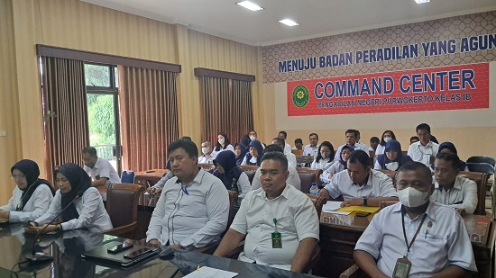 Senin, 16 Januari 2023. Bertempat di ruang Command Center Pengadilan Negeri Purwokerto dilaksanakan Rapat Monitoring dan Evaluasi Kinerja Bulan Desember 2022.Rapat dipimpin oleh Ketua Pengadilan Negeri Purwokerto Bapak Enan Sugiarto, S.H.,M.H, Wakil Ketua Pengadilan Negeri Purwokerto Bapak Rudy Ruswoyo, S.H.,M.H. dan diikuti oleh seluruh Hakim, ASN dan PPNPN Pengadilan Negeri Purwokerto.Hakim Pengawas bidang melaporkan hasil pengawasan yang di lakukan di bulan Desember 2022 serta tindak lanjut dari temaun-temuan dan kendala-kendala yang terjadi pada bulan sebelumnya.Kendala dan hambatan yang terjadi dibahas penyebabnya. Ketua Pengadilan Negeri Purwokerto memberikan arahan - arahan dan solusi mengatasi kendala dan hambatan yang terjadi dalam pekerjaan. Serta Pemberian Reward kepada ASN dan PPNPN