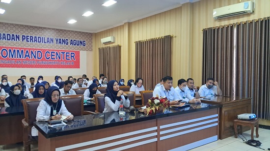 Senin, 31 Oktober 2022, bertempat di Ruang Command Centre Pengadilan Negeri Purwokerto, Ketua Pengadilan Negeri Purwokerto Bapak Enan Sugiarto, S.H.,M.H. melaksanakan Pemaparan Hasil "Pembinaan dan Sosialisasi E-Berpadu dan Eksekusi bersama Aparat Penegak Hukum dan Pengadilan Negeri Se-Wilayah Hukum Pengadilan Tinggi Semarang" kepada Hakim dan ASN Pengadilan Negeri Purwokerto.