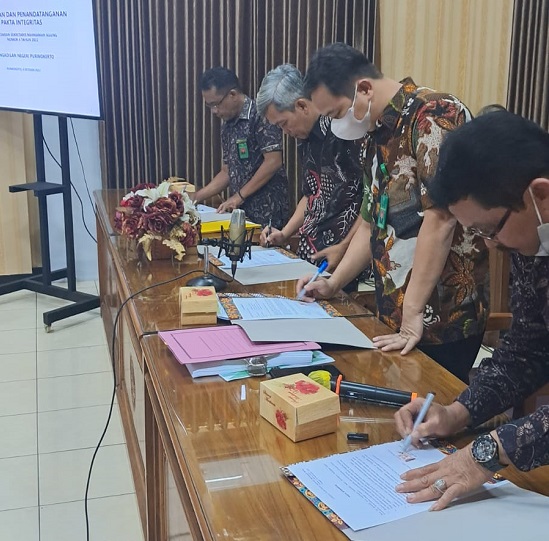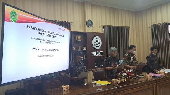 Kamis, 6 Oktober 2022, Pengadilan Negeri Purwokerto telah melaksanakan Pembacaan dan Penandatanganan Pakta Integritas yang dilaksanakan oleh Ketua, Wakil Ketua, Hakim, Pejabat Struktural dan Fungsional, Para ASN dan PPNPN Pengadilan Negeri Purwokerto.