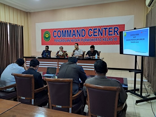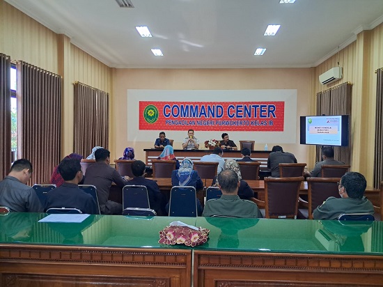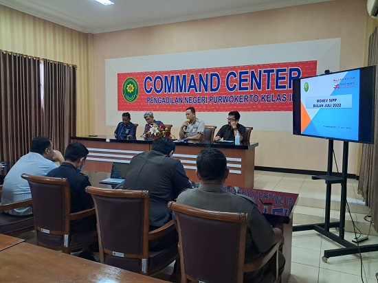 Rabu, 27 Juli 2022. Bertempat di ruang Command Center Pengadilan Negeri Purwokerto dilaksanakan Rapat Monitoring dan Evaluasi Kinerja Semester I Tahun 2022.Rapat dipimpin oleh Ketua Pengadilan Negeri Purwokerto Bapak Enan Sugiarto, S.H.,M.H, Wakil Ketua Pengadilan Negeri Purwokerto Bapak Rudy Ruswoyo, S.H.,M.H. dan diikuti oleh seluruh Hakim, ASN dan PPNPN Pengadilan Negeri Purwokerto.Hakim Pengawas bidang melaporkan hasil pengawasan yang di lakukan di Semester I Tahun 2022 serta tindak lanjut dari temaun-temuan dan kendala-kendala yang terjadi pada Semester I Tahun 2022.Kendala dan hambatan yang terjadi dibahas penyebabnya. Ketua Pengadilan Negeri Purwokerto memberikan arahan arahan dan solusi mengatasi kendala dan hambatan yang terjadi dalam pekerjaan.