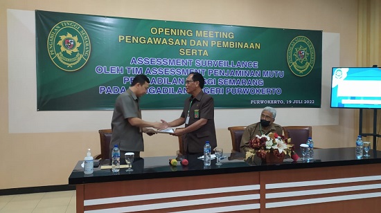 Selasa, 19 Juli 2022, bertempat di ruang Comand Centre Pengadilan Negeri Purwokerto, Keluarga Besar Pengadilan Negeri Purwokerto menerima kunjungan Tim Assessment Penjaminan Mutu Pengadilan Tinggi Semarang pada Pengadilan Negeri Purwokerto yang terdiri dari Hakim Tinggi YM.SANTUN SIMAMORA, S.H., M.H. dan AGUS HARIYADI, S.H.,M.Hum beserta anggota. Tujuan diadakannya audit adalah untuk menjaga mutu pelayanan kepada masyarakat pencari keadilan agar tetap prima guna mewujudkan Badan Peradilan yang Agung sesuai dengan visi dan misi Mahkamah Agung Republik Indonesia.