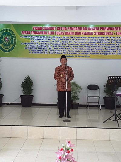 Acara Pisah Sambut Ketua Pengadilan Negeri Klas IB Purwokerto, Pengantar Alih Tugas Hakim dan Pejabat Struktural/Fungsional Pengadilan Negeri Klas IB Purwokerto yang dihadiri oleh jajaran Muspida Kabupaten Banyumas. Pada hari Selasa, tanggal 19 Januari 2016 atas nama sebagai berikut :