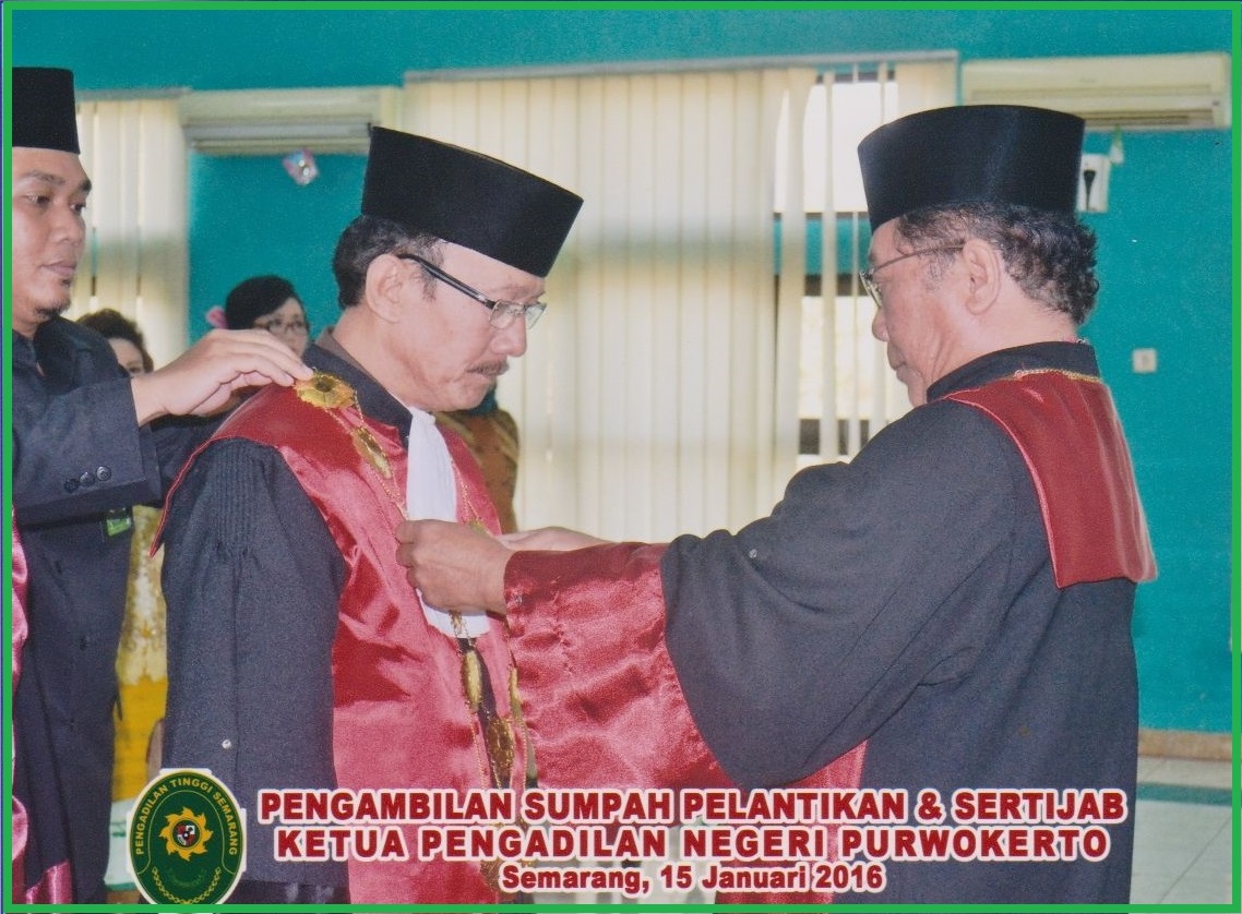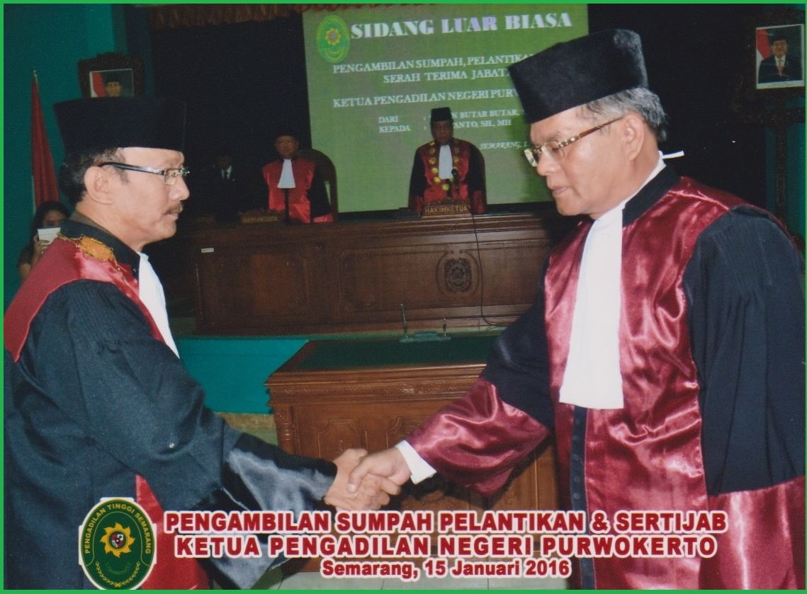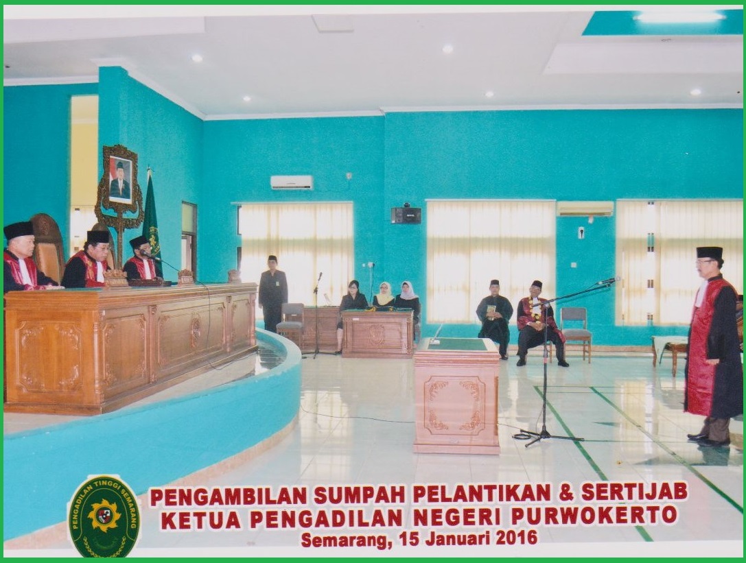 Pengambilan Sumpah, Pelantikan dan, Serah Terima Jabatan Ketua Pengadilan Negeri Purwokerto dari Bapak Gosen Butar-Butar SH., M.Hum., kepada Bapak Purwanto, SH., MH., pada hari Jumat, tanggal 15 Januari 2016. Pengambilan Sumpah dan Pelantikan dilakukan oleh Ketua Pengadilan Tinggi Semarang Bapak Dr. H. Muh. Daming Sunusi, SH., M.Hum., Pengambilan Sumpah dan Pelantikan dihadiri oleh Hakim-Hakim Pengadilan Tinggi Semarang, Pejabat Struktural dan Fungsional PT Semarang, Hakim-Hakim PN Purwokerto, Panitera, Sekretaris dan Pejabat Struktural dan Fungsional PN Purwokerto serta segenap Pejabat Struktural dan Fungsional di Wilayah Pengadilan Tunggi Semarang.