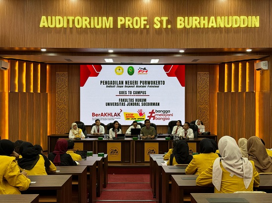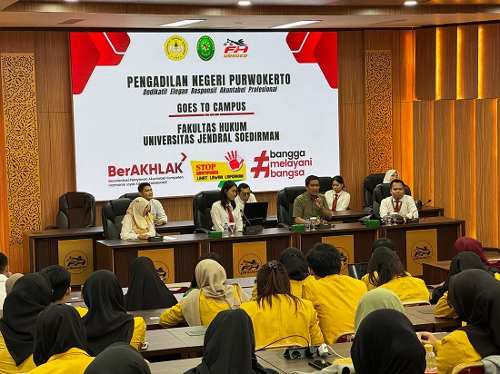 Selasa, 11 Juni 2024. Wakil Ketua Pengadilan Negeri Purwokerto Bapak Eddy Daulatta Sembiring, S.H.,M.H. beserta para Calon Hakim Pengadilan Negeri Purwokerto melaksanakan kegiatan Pengadilan Negeri Purwokerto goes to campus pada Fakultas Hukum Universitas Jenderal Soedirman Purwokerto.