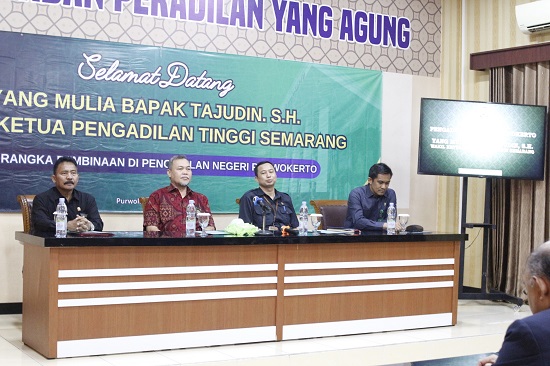 Rabu, 5 Juni 2024. Pengadilan Negeri Purwokerto Kelas IB mendapat kunjungan dan pembinaan oleh Wakil Ketua Pengadilan Tinggi Semarang YM. Bapak Tajudin, S.H. didampingi oleh Panitera Pengadilan Tinggi Semarang Bapak Tjatur Wahjoe Boewana SP, S.H., M.Hum.. Kegiatan diawali dengan pembinaan terhadap petugas PTSP pada Pengadilan Negeri Purwokerto terkait kiat memberikan pelayanan yang prima bagi para pencari keadilan, selanjutnya Bapak WKPT mengunjungi setiap ruangan pada bidang kepaniteraan dan kesekretaritan. Acara dilanjutkan dengan pembinaan kepada seluruh Aparatur Sipil Negera Pengadilan Negeri Purwokerto di ruang Command Centre Pengadilan Negeri Purwokerto. Pada pembinaan disampaikan kepada seluruh ASN untuk terus meningkatkan disiplin, motivasi dan semangat kinerja agar tercipta layanan yang optimal bagi pengguna layanan. Acara diakhiri dengan doa dan foto bersama.