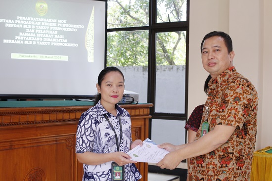 Jumat, 8 Maret 2024, bertempat di Ruang Sidang Inklusif Pengadilan Negeri Purwokerto telah dilaksanakan Perjanjian Kerjasama antara Pengadilan Negeri Purwokerto dengan SLB B YAKUT Purwokerto dan Pelatihan Pelayanan menggunakan Bahasa Isyarat bagi Penyandang Disabilitas.