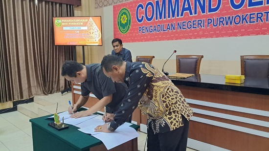 Selasa, 2 Januari 2024. Bertempat di ruang Comand Centre, Pengadilan Negeri Purwokerto melakaanakan Penandatanganan Pakta Integritas dan Perjanjian Kinerja Tahun 2024. Dipimpin oleh Ketua Pengadilan Negeri Purwokerto Bapak Rudy Ruswoyo, S.H.,M.H. dan diikuti oleh Wakil Ketua Pengadilan Negeri Purwokerto, para Hakim, Pejabat Struktural dan Fungsional serta seluruh ASN Pengadilan Negeri Purwokerto.