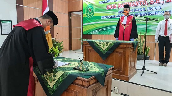 Purwokerto, 21 Januari 2021. Bertempat di Ruang Sidang Utama Pengadilan Negeri Purwokerto, di laksanakan acara Pengambilan Sumpah Jabatan dan Pelantikan Bapak Rios Rahmanto, S.H.,M.H sebagai Wakil Ketua Pengadilan Negeri Purwokerto oleh Ketua Pengadilan Negeri Purwokerto Bapak Muhammad Arif Nuryanta, S.H, M.H.