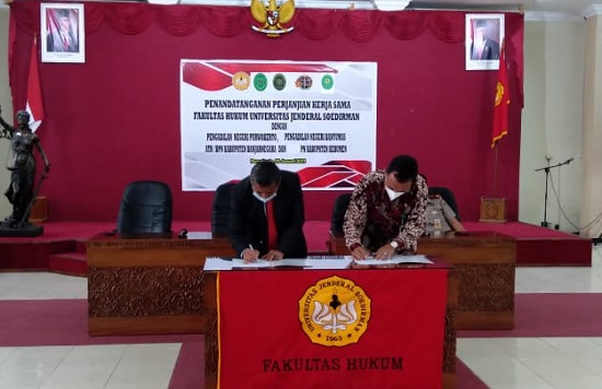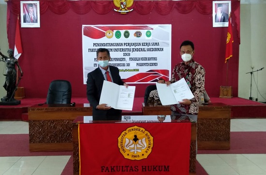 Jumat, 29 Januari 2021. Fakultas Hukum Universitas Jenderal Soedirman menjalin kerjasama dengan Pengadilan Negeri Purwokerto, Perjanjian Kerja Sama ditandatangani oleh Dekan FH Unsoed Prof. Ade Maman Suherman, S.H.,M.Sc, Ketua Pengadilan Negeri Purwokerto Muhammad Arif Nuryanta, S.H.,M.H.,