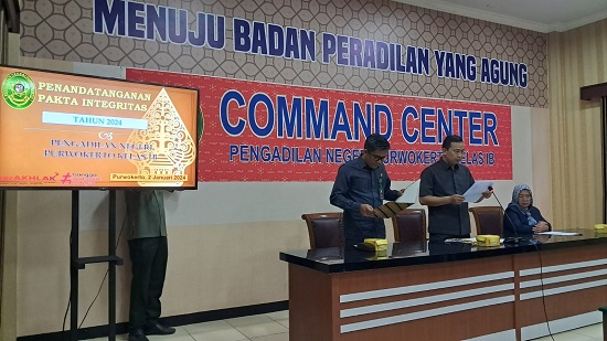 Selasa, 2 Januari 2024. Bertempat di ruang Comand Centre, Pengadilan Negeri Purwokerto melakaanakan Penandatanganan Pakta Integritas dan Perjanjian Kinerja Tahun 2024. Dipimpin oleh Ketua Pengadilan Negeri Purwokerto Bapak Rudy Ruswoyo, S.H.,M.H. dan diikuti oleh Wakil Ketua Pengadilan Negeri Purwokerto, para Hakim, Pejabat Struktural dan Fungsional serta seluruh ASN Pengadilan Negeri Purwokerto.
